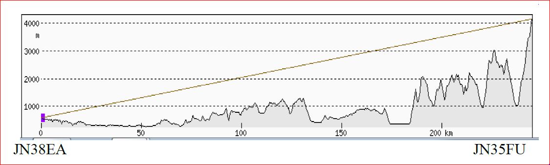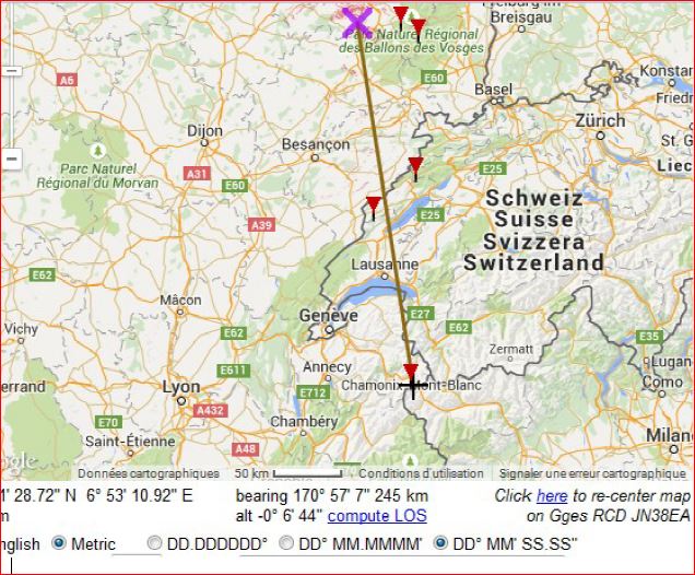Un rapide profil de terrain m’avait montré hier soir qu’il n’y avait aucun obstacle entre JN38EA et JN35FU, soit une distance de 245 km. Az 170°, ce qui avec une simple boussole ne pose aucun problème pour trouver la direction du Mt Blanc, puisque c’est « un poil à gauche du SUD » !