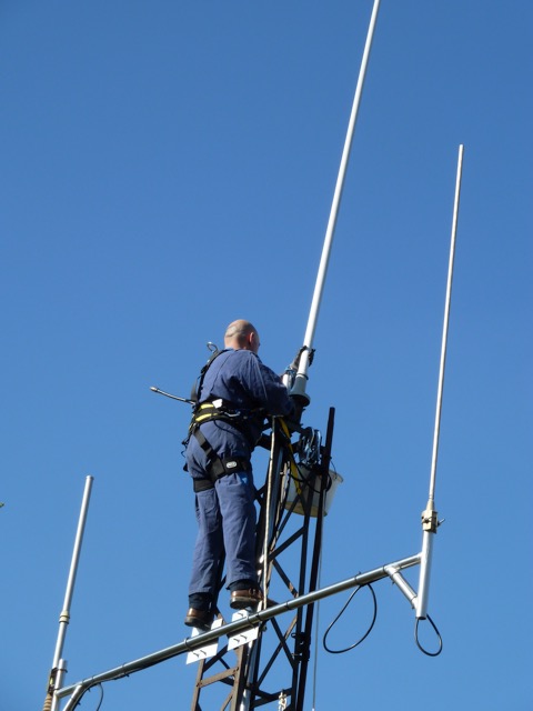 Jean (F4BKE) prends de la hauteur dans le but de démonter l’ancienne antenne X510 Diamond, dans un fourreau fibre de verre
